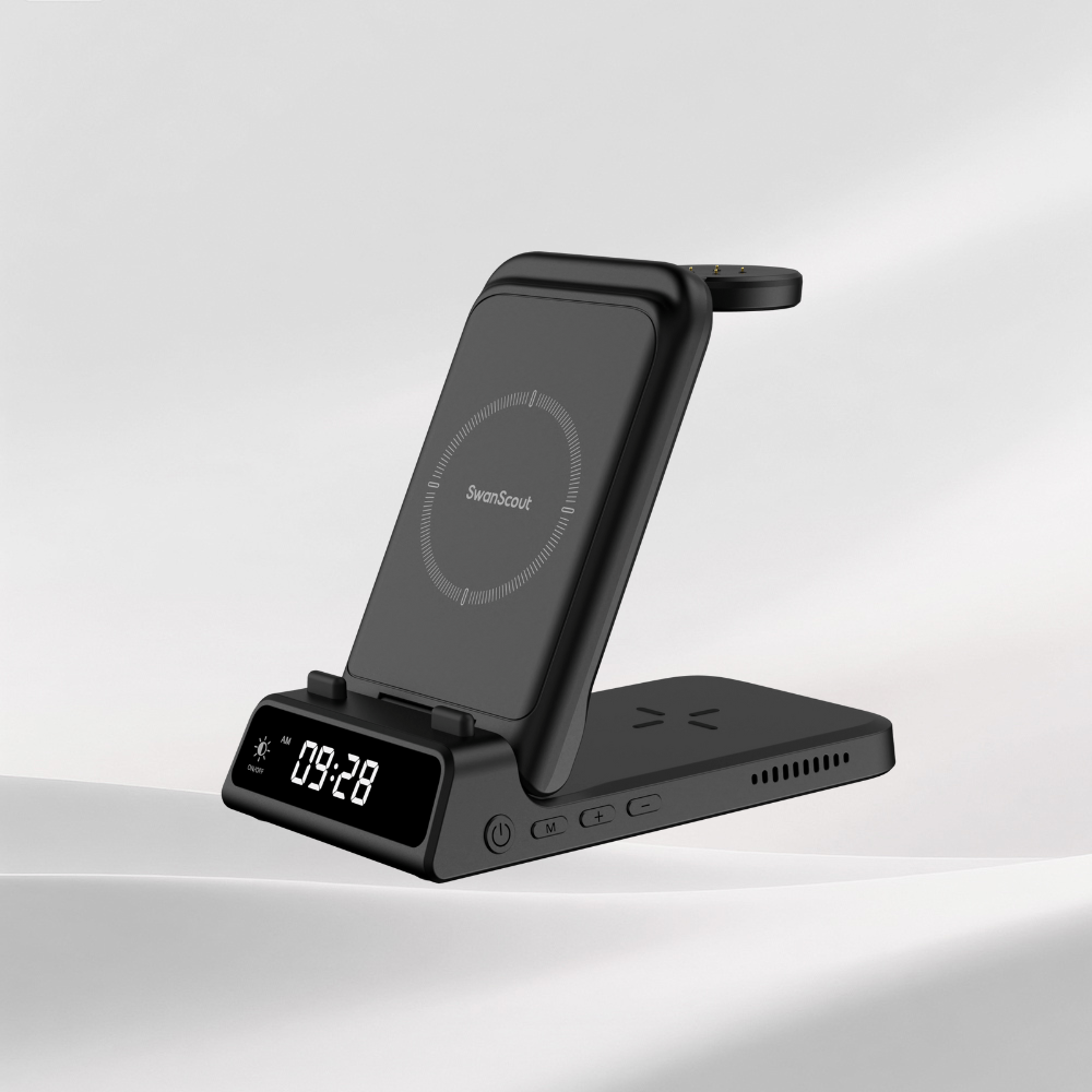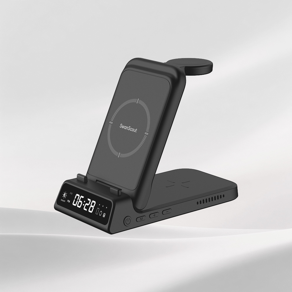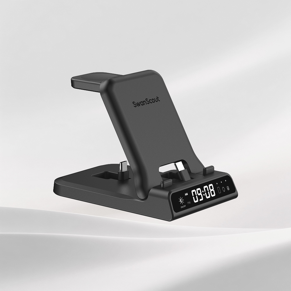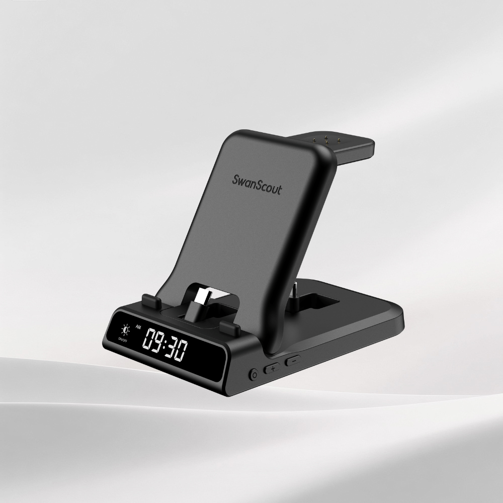 Die faltbaren kabellosen Ladegeräte von SwanScout unterstützen in der Regel zwei Lademodi: Stellen Sie das Ladegerät auf, um das Telefon vertikal zu halten – ideal, um während des Ladevorgangs Inhalte anzusehen oder Nachrichten zu checken. Wenn der Ladevorgang nicht funktioniert, versuchen Sie, den Faltwinkel anzupassen, um eine bessere Ausrichtung mit der Spule Ihres Telefons zu erzielen. Wenn das Ladegerät flach liegt, kann es Telefone oder kabellose Ohrhörer mit Strom versorgen. Richten Sie die Ohrhörer für eine genaue Positionierung an dem auf dem Ladepad markierten Spulensymbol aus. Dieses flexible Design unterstützt verschiedene Gerätelayouts und verbessert sowohl den Komfort als auch die Kompatibilität.