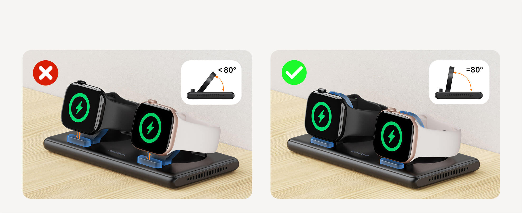 Mantén tu mesita de noche ordenada mientras cargas ambos relojes por la noche — despiértate con los dispositivos completamente cargados.