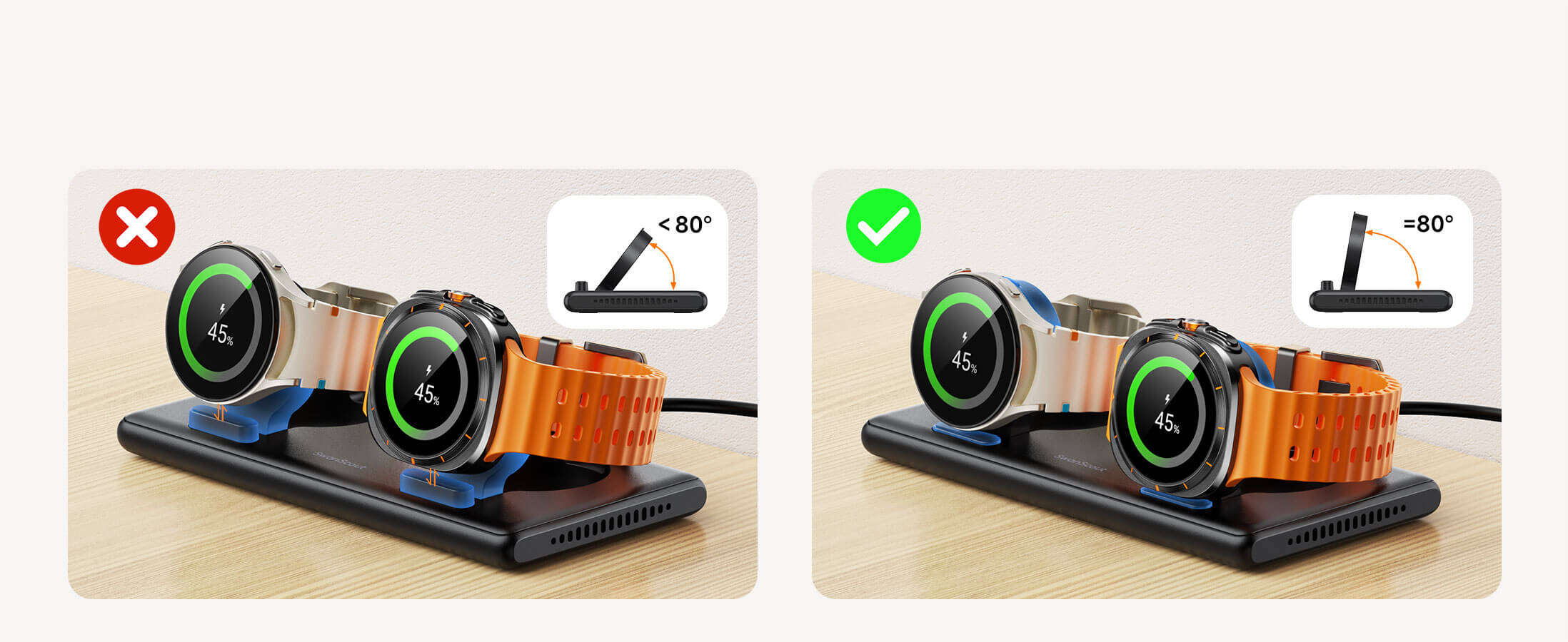 Mantenga su mesita de noche ordenada mientras carga ambos relojes durante la noche — despierte con dispositivos completamente cargados.