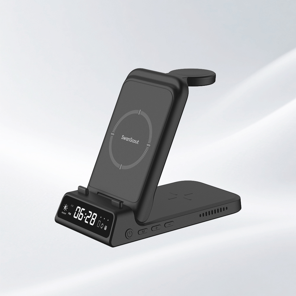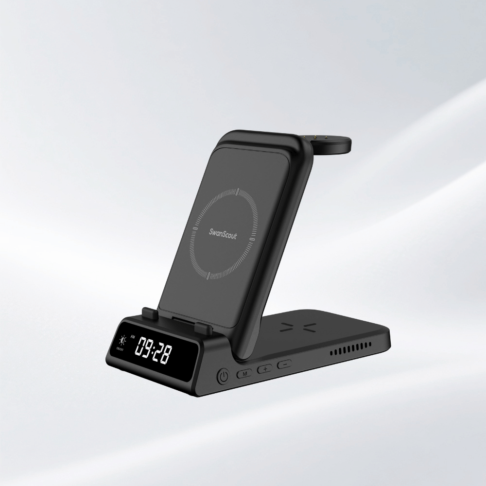 SwanScout’s 3-in-1 charging station supports non-Samsung devices compatible with wireless charging standards (e.g., select iPhones or Android phones and wireless earbuds) for the phone and earbud areas, but the watch area is exclusive to Galaxy Watch. For magnetic charging, Samsung phones require a magnetic case to ensure proper charging.
