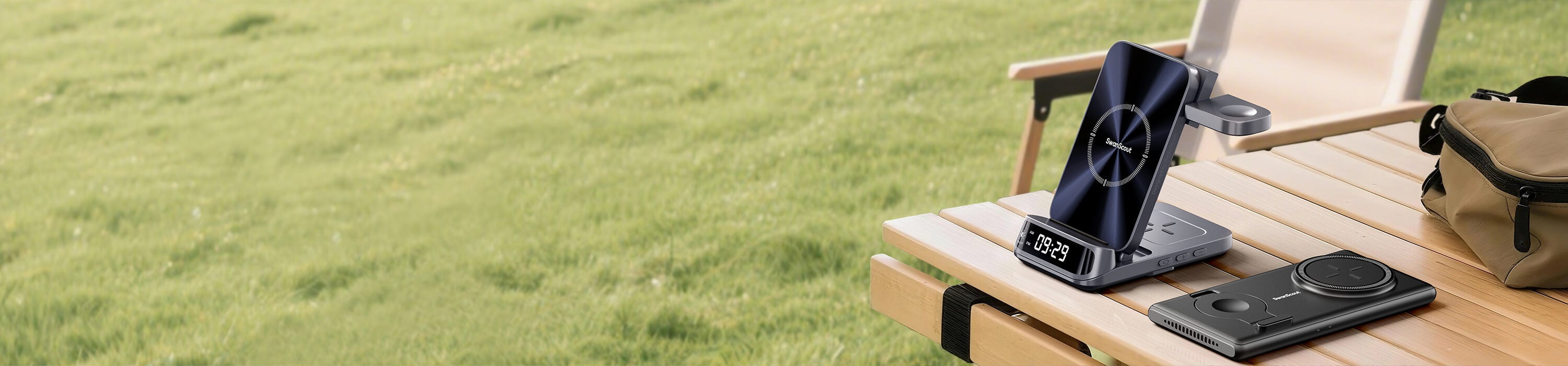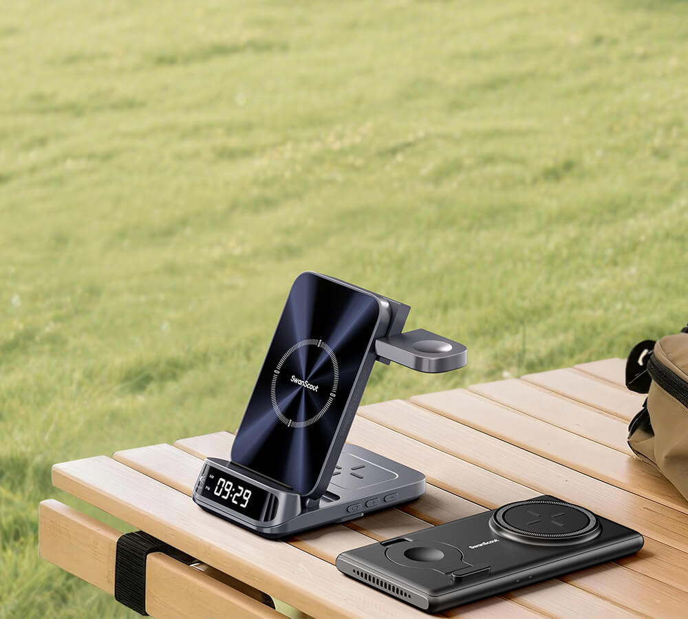 SwanScoutの3-in-1充電ステーションは、スマートフォンとイヤホン部分ではワイヤレス充電規格に対応したSamsung以外のデバイス(一部のiPhoneやAndroidスマートフォン、ワイヤレスイヤホンなど)に対応していますが、ウォッチ部分はGalaxy Watch専用です。磁気充電を使用する場合、Samsungスマートフォンは確実に充電するために磁気ケースを装着する必要があります。