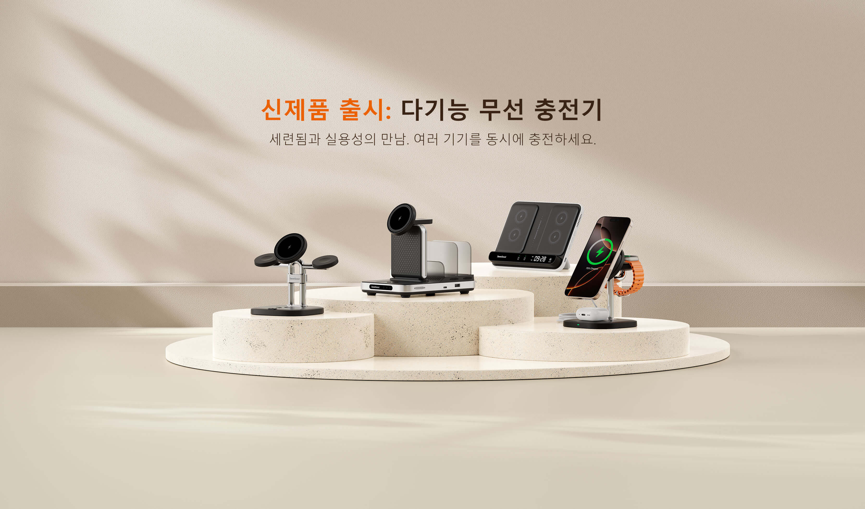 "이 제품은 잘 만들어졌으며 휴대폰, 이어버드, 시계를 동시에 충전할 수 있는 기능을 제공합니다. 시계 기능이 있어 침대 옆 테이블에 딱 맞습니다. 밤에 모든 것을 충전하여 하루 종일 사용할 수 있습니다."