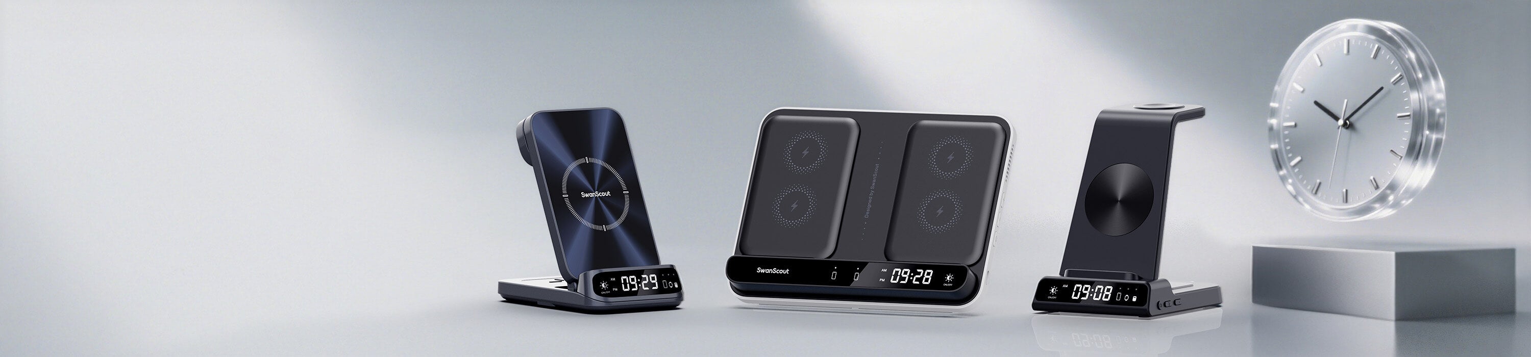 SwanScout 的时钟无线充电器集快速磁力充电和清晰的数字时钟于一体,设计优雅。无论您在书桌、床边还是学习区,都能为手机充电,让您按时完成日程安排,同时保持整洁有序的空间。
