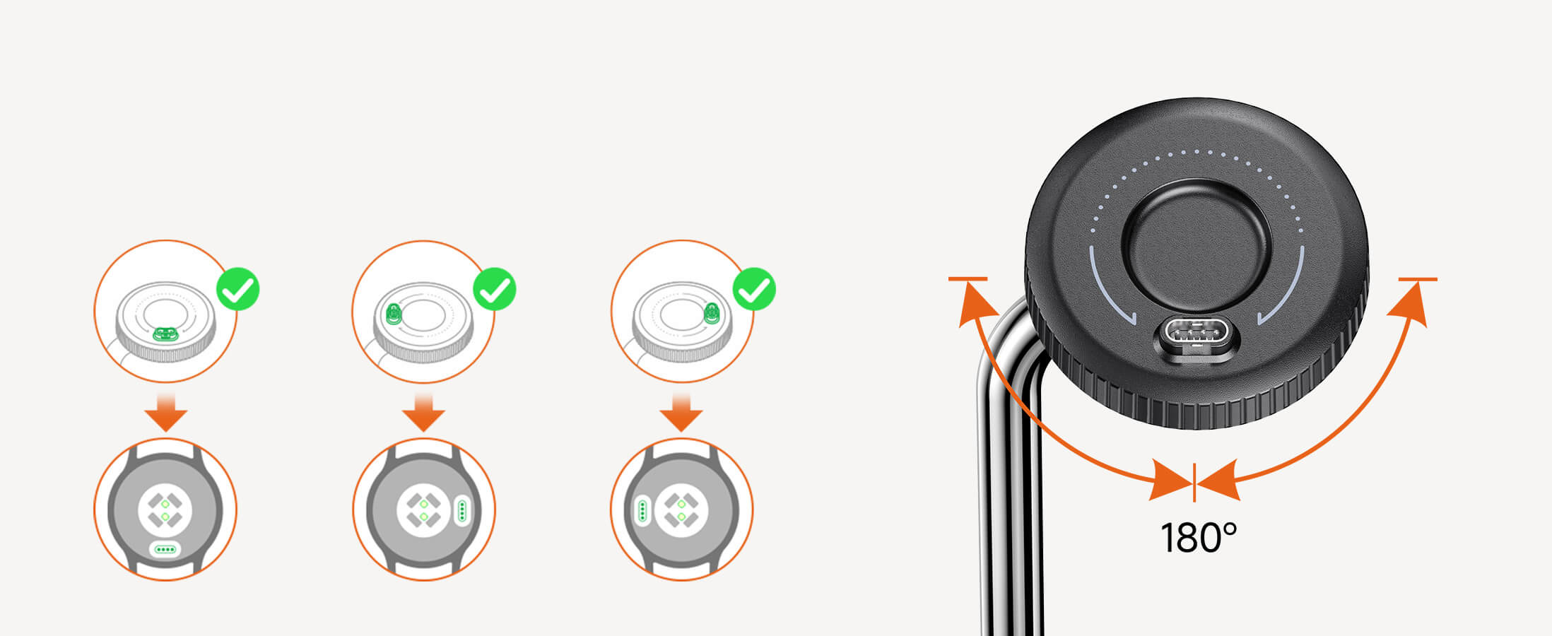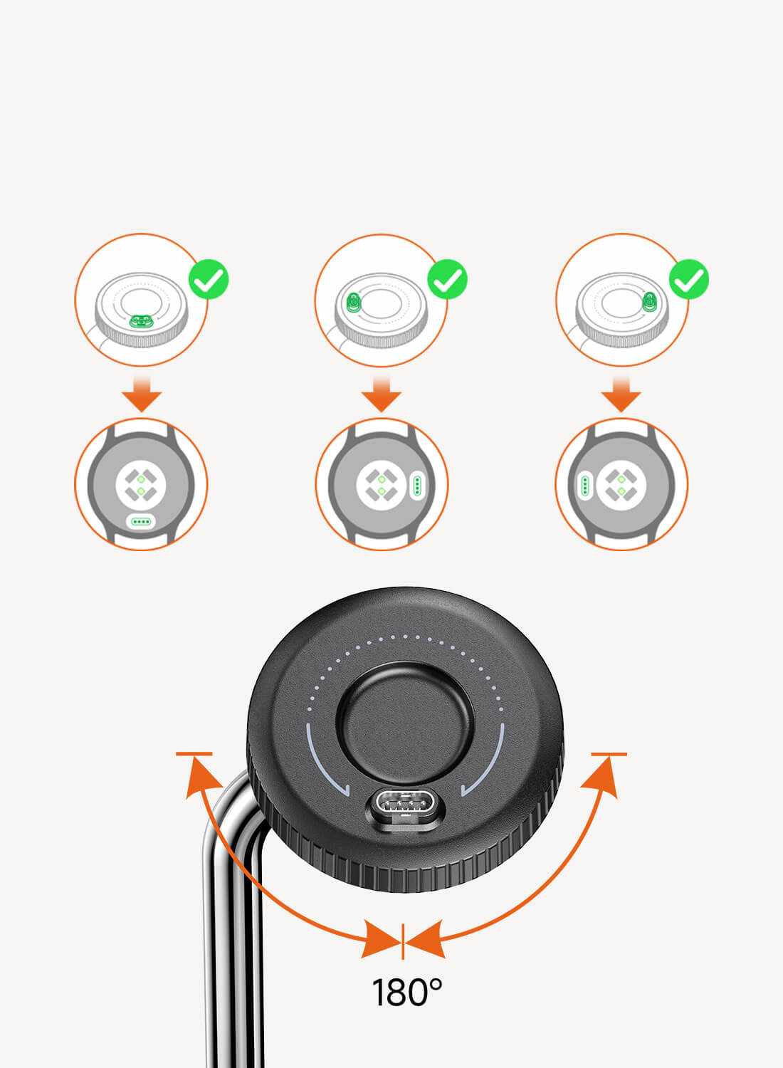 充电头可以向左或向右旋转90°,以对齐手表的充电口。同时也支持垂直充电,适用于底部充电口的手表,确保广泛兼容。 - 这款产品还有其他名称或版本吗?