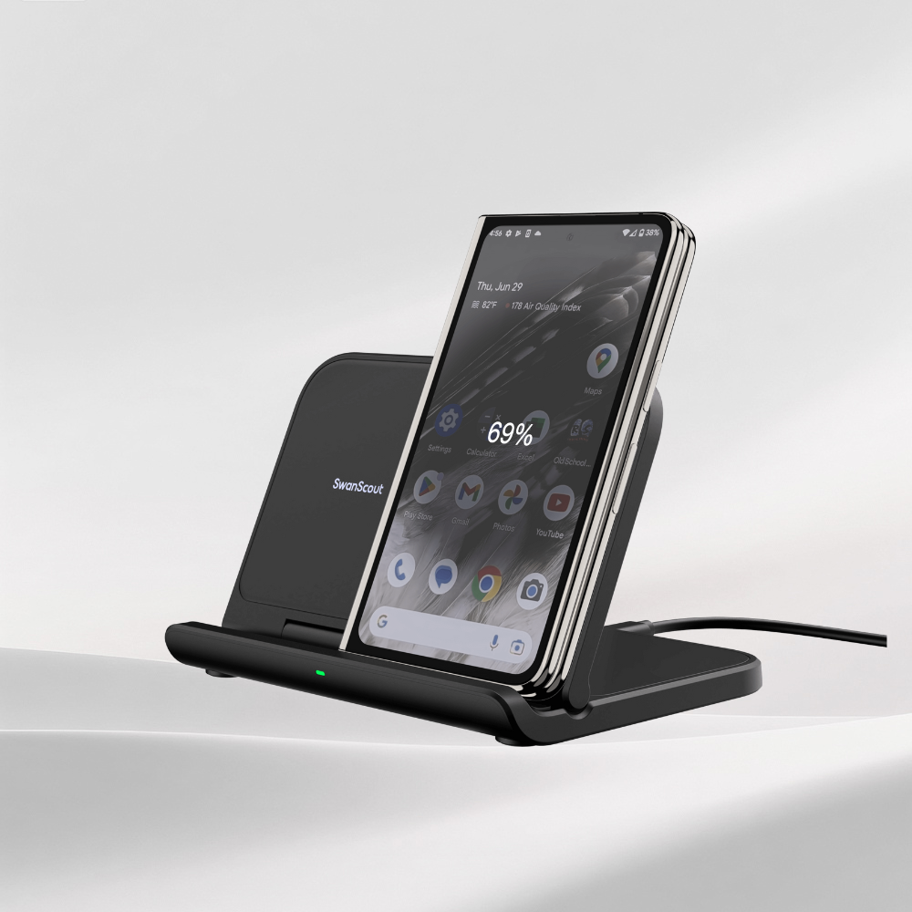 由於 Pixel 9 Pro Fold 上的線圈位置與其他 Pixel 型號略有不同,我們建議使用 SwanScout 708G2。為確保最佳對準和穩定充電,708G2 包含一個可拆卸的塑膠定位墊。在為 Pixel 9 Pro Fold 充電時使用該墊子來抬高手機並精確對準線圈。對於其他 Pixel 型號,則不需要該墊子。這種周到的設計可確保跨型號相容性、高效充電和安全的設備放置。